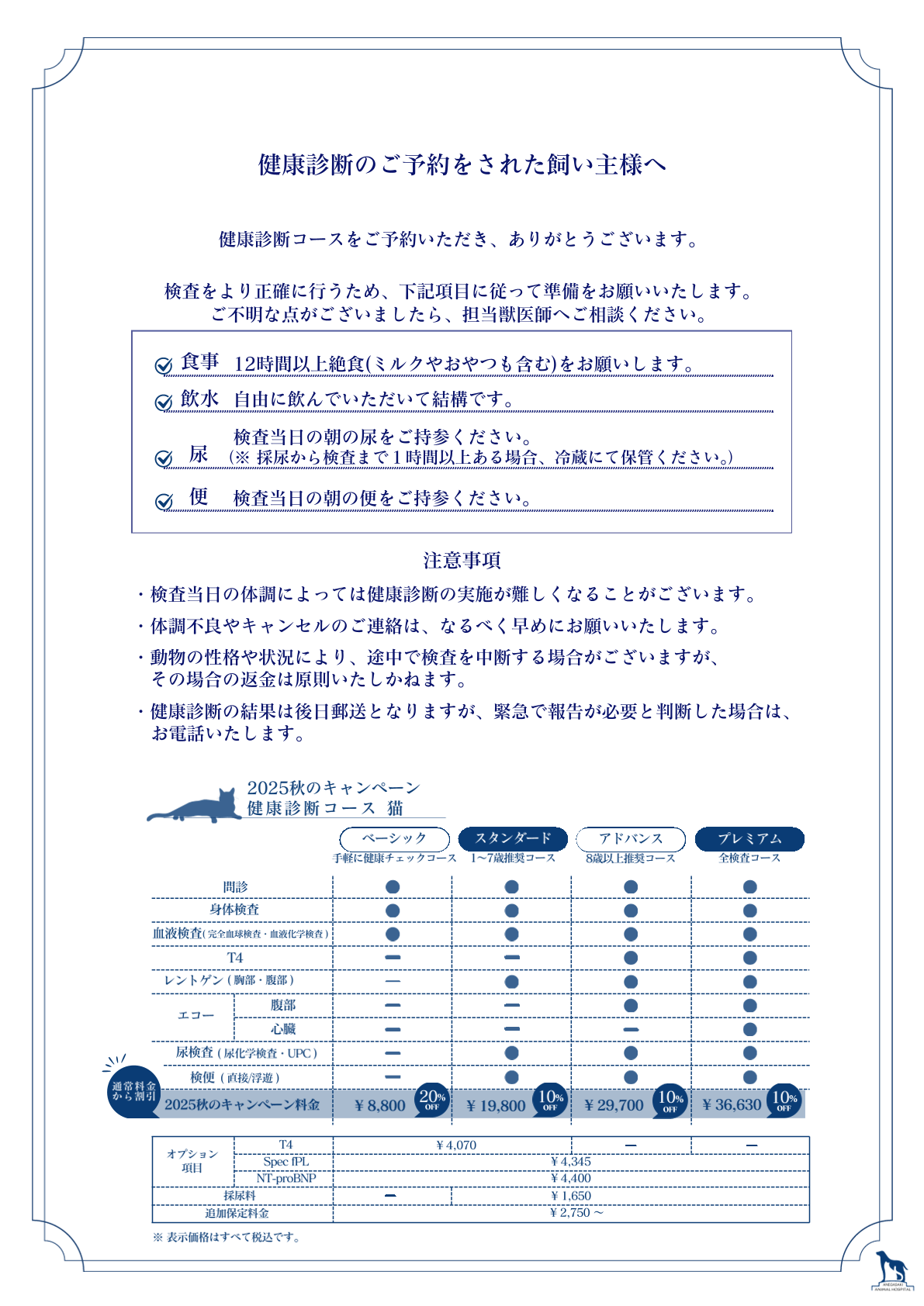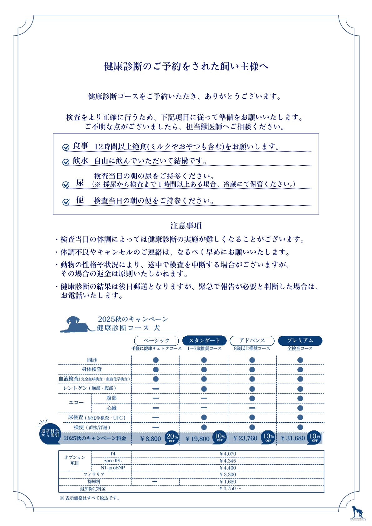 この機会にぜひ健康診断を受けていただき、愛犬・愛猫の健康状態の把握及び病気の早期発見、早期治療に繋げていきましょう。