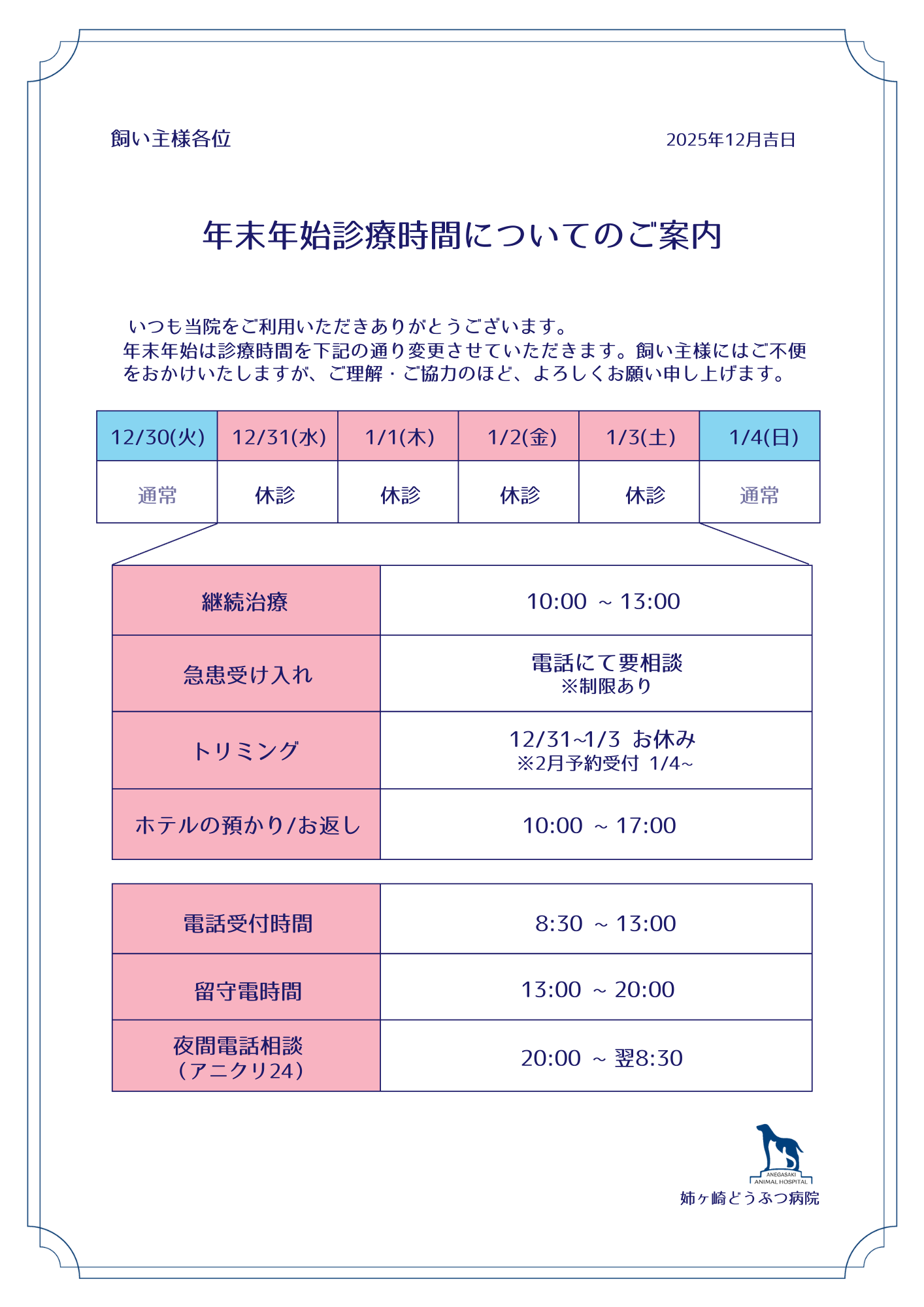 年末年始は診療体制が通常と異なりますので、ご来院の際はあらかじめご確認いただけますと幸いです。